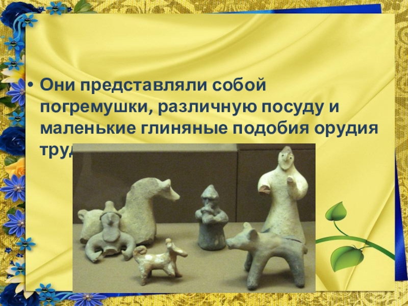 Слайд 5Они представляли собой погремушки, различную посуду и маленькие глиняные подобия орудия