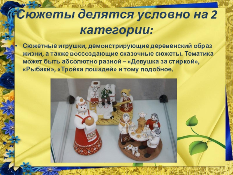 а также воссоздающие сказочные сюжеты. Тематика может быть абсолютно разной – «Девушка за стиркой», «Рыбаки», «Тройка лошадей» и тому подобное.