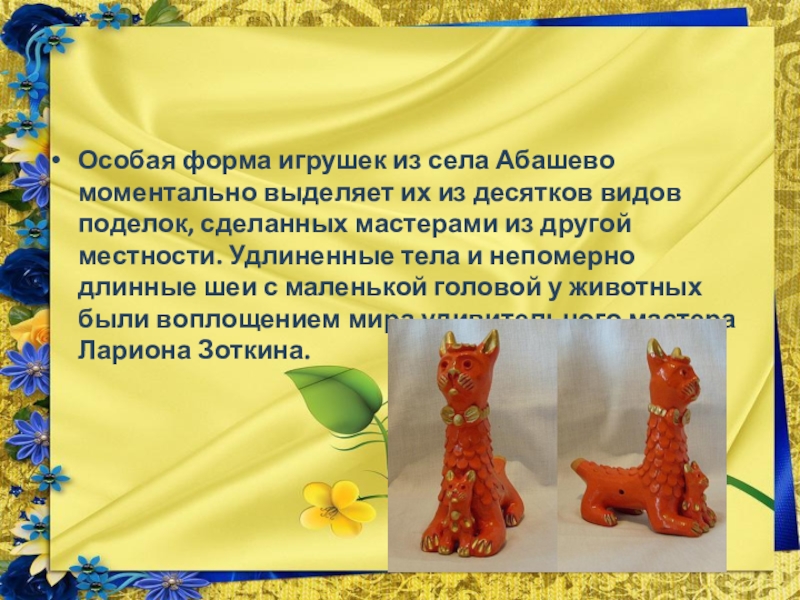 Слайд 18Особая форма игрушек из села Абашево моментально выделяет их из десятков