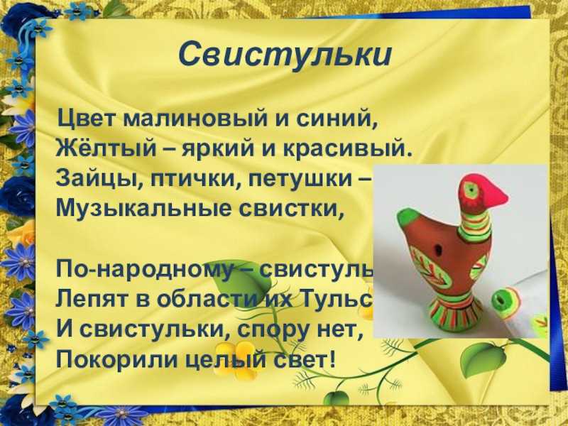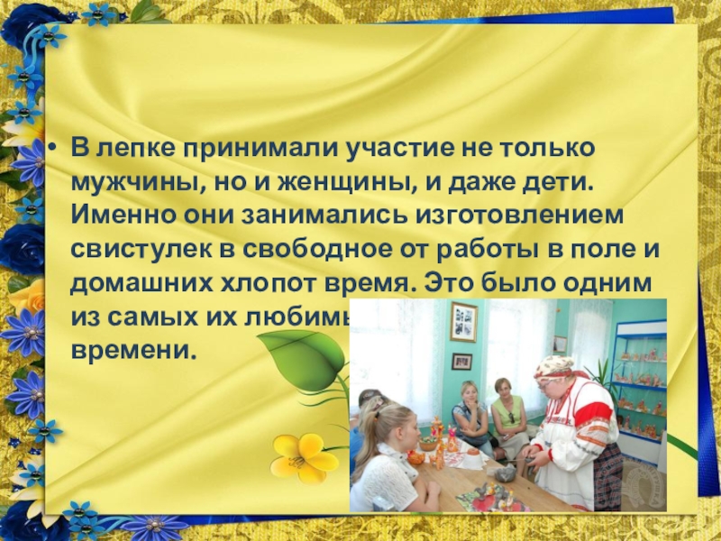 даже дети. Именно они занимались изготовлением свистулек в свободное от работы в поле и домашних хлопот время. Это было одним из самых их любимых занятий того времени.