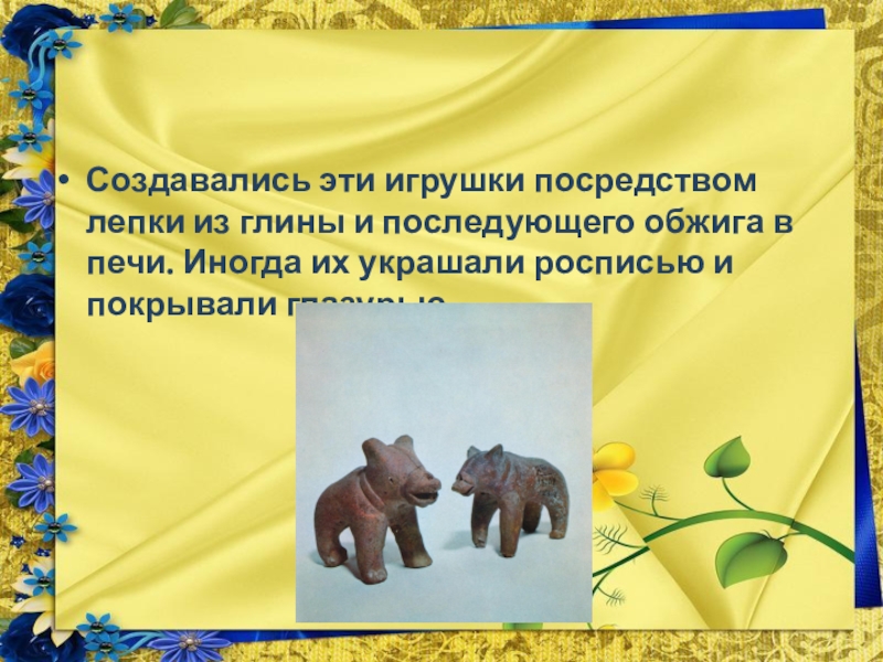 Слайд 7Создавались эти игрушки посредством лепки из глины и последующего обжига в