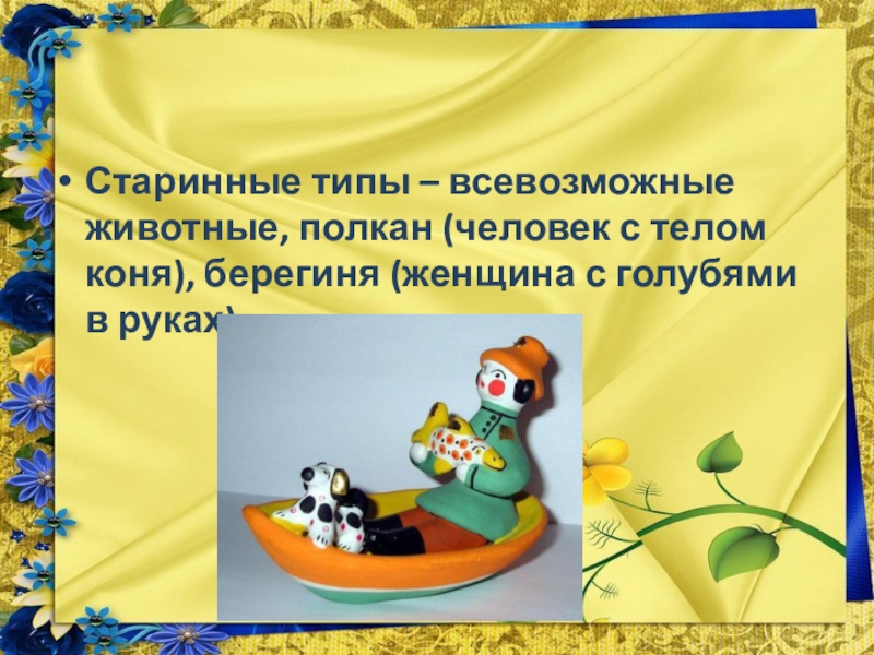 Слайд 15Старинные типы – всевозможные животные, полкан (человек с телом коня), берегиня