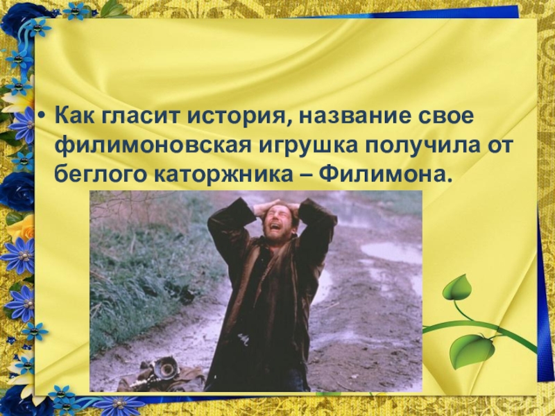 Слайд 38Как гласит история, название свое филимоновская игрушка получила от беглого каторжника