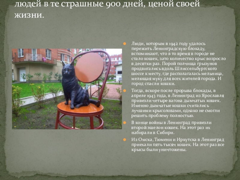 Люди, которым в 1942 году удалось пережить Ленинградскую блокаду, вспоминают, что в то время в городе не стало кошек, зато количество крыс возросло в десятки раз. Порой полчища грызунов продвигались вдоль Шлиссельбургского шоссе к месту, где располагалась мельница, мелющая муку для всех жителей города. И город спасли кошки.