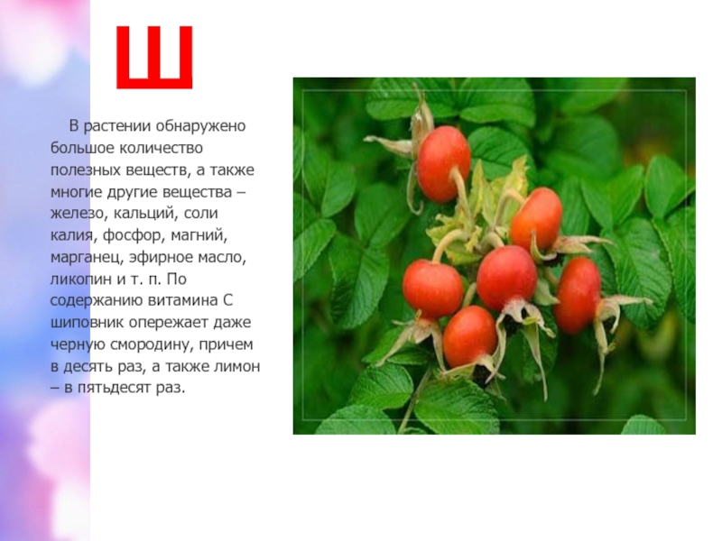 вещества – железо, кальций, соли калия, фосфор, магний, марганец, эфирное масло, ликопин и т. п. По содержанию витамина C шиповник опережает даже черную смородину, причем в десять раз, а также лимон – в пятьдесят раз.
