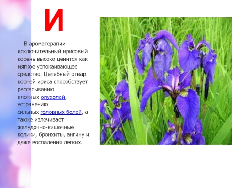 Целебный отвар корней ириса способствует рассасыванию плотных опухолей, устранению сильных головных болей, а также излечивает желудочно-кишечные колики, бронхиты, ангину и даже воспаления легких.