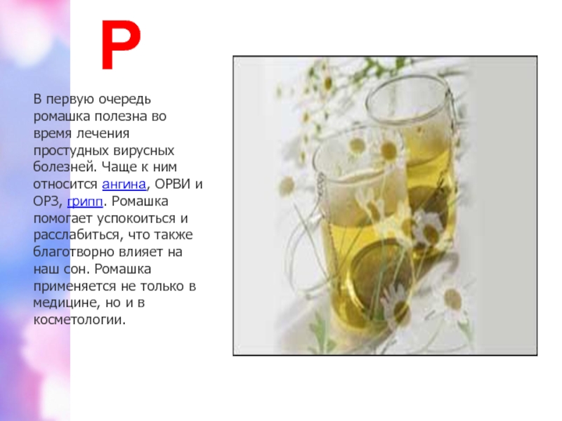к ним относится ангина, ОРВИ и ОРЗ, грипп. Ромашка помогает успокоиться и расслабиться, что также благотворно влияет на наш сон. Ромашка применяется не только в медицине, но и в косметологии.