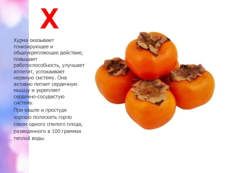 Хурма оказывает тонизирующее и общеукрепляющее действие, повышает работоспособность, улучшает аппетит, успокаивает