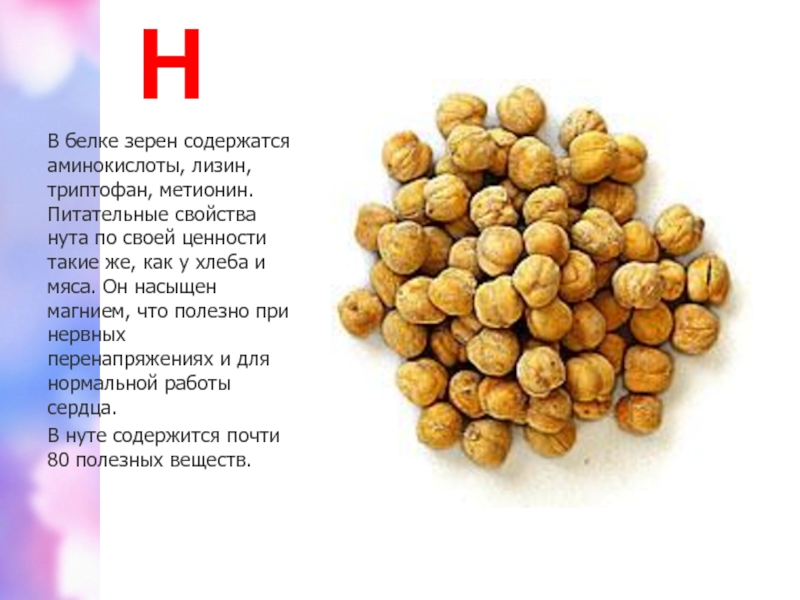 В белке зерен содержатся аминокислоты, лизин, триптофан, метионин. Питательные свойства нута