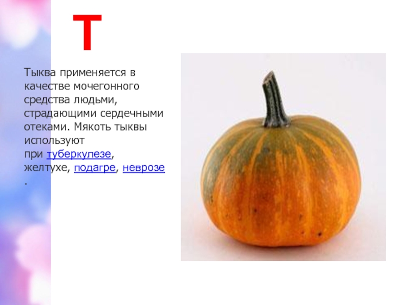 тыквы используют при туберкулезе, желтухе, подагре, неврозе.