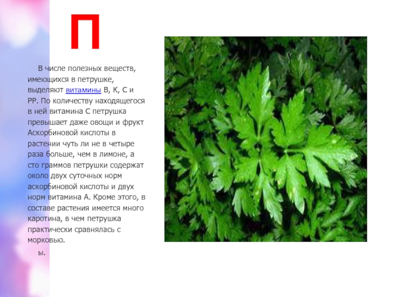 РР. По количеству находящегося в ней витамина С петрушка превышает даже овощи и фрукт Аскорбиновой кислоты в растении чуть ли не в четыре раза больше, чем в лимоне, а сто граммов петрушки содержат около двух суточных норм аскорбиновой кислоты и двух норм витамина А. Кроме этого, в составе растения имеется много каротина, в чем петрушка практически сравнялась с морковью.