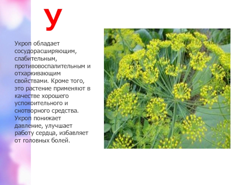 Укроп обладает сосудорасширяющим, слабительным, противовоспалительным и отхаркивающим свойствами. Кроме того, это