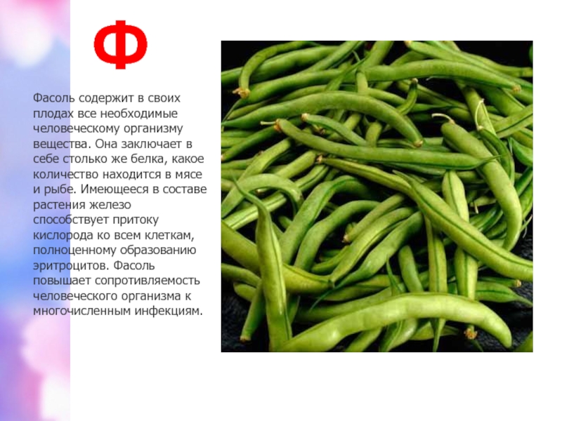 заключает в себе столько же белка, какое количество находится в мясе и рыбе. Имеющееся в составе растения железо способствует притоку кислорода ко всем клеткам, полноценному образованию эритроцитов. Фасоль повышает сопротивляемость человеческого организма к многочисленным инфекциям.