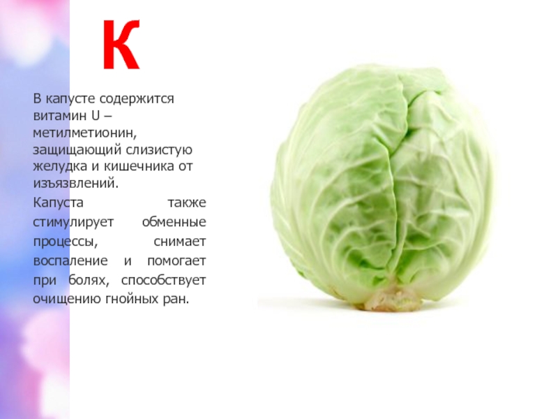 В капусте содержится витамин U – метилметионин, защищающий слизистую желудка и
