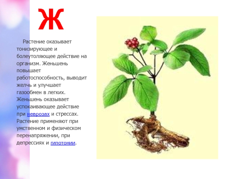 выводит желчь и улучшает газообмен в легких. Женьшень оказывает успокаивающее действие при неврозах и стрессах. Растение применяют при умственном и физическом перенапряжении, при депрессиях и гипотонии.