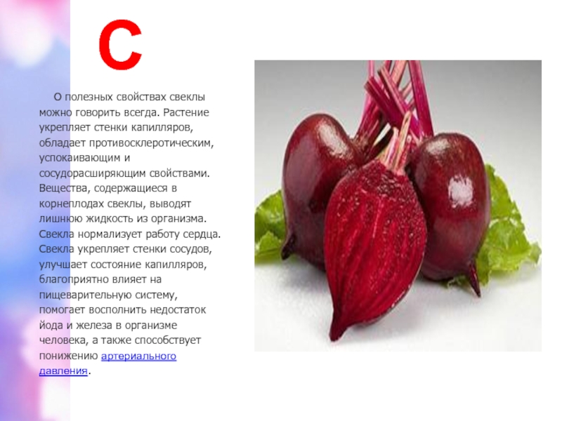 обладает противосклеротическим, успокаивающим и сосудорасширяющим свойствами. Вещества, содержащиеся в корнеплодах свеклы, выводят лишнюю жидкость из организма. Свекла нормализует работу сердца. Свекла укрепляет стенки сосудов, улучшает состояние капилляров, благоприятно влияет на пищеварительную систему, помогает восполнить недостаток йода и железа в организме человека, а также способствует понижению артериального давления.