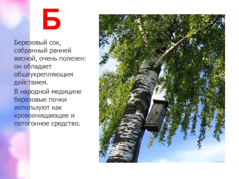 Березовый сок, собранный ранней весной, очень полезен: он обладает общеукрепляющим действием.
