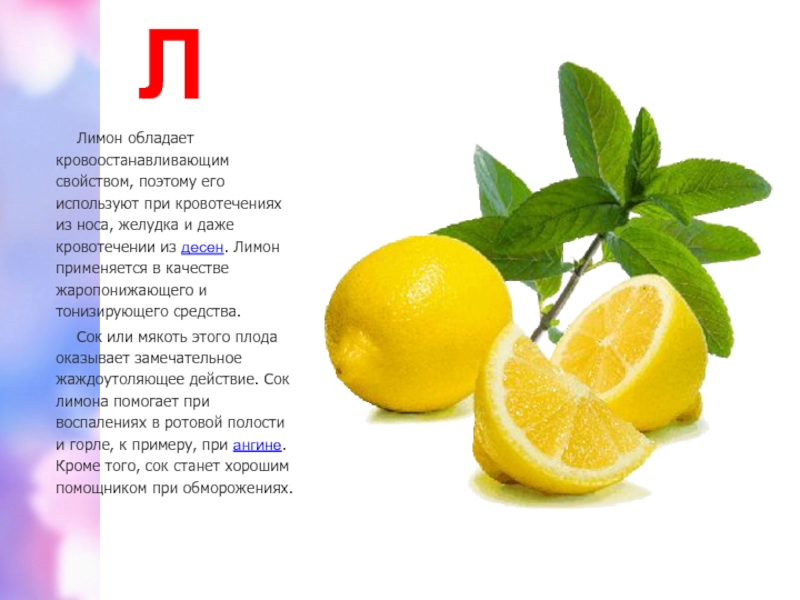желудка и даже кровотечении из десен. Лимон применяется в качестве жаропонижающего и тонизирующего средства.