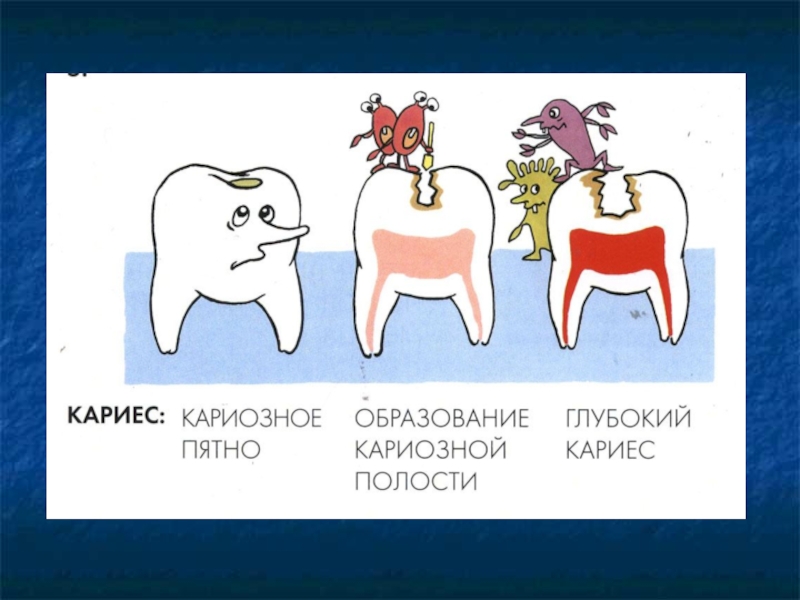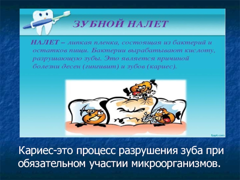 Слайд 19 Кариес-это процесс разрушения зуба при обязательном участии микроорганизмов.