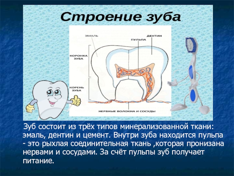 Слайд 9 Зуб состоит из трёх типов минерализованной ткани: эмаль, дентин