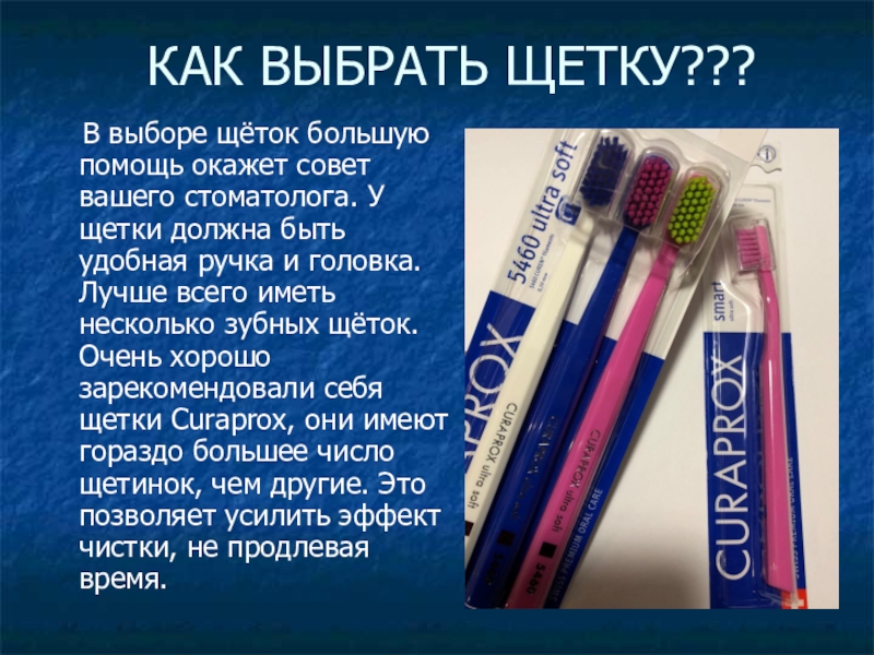 совет вашего стоматолога. У щетки должна быть удобная ручка и головка. Лучше всего иметь несколько зубных щёток. Очень хорошо зарекомендовали себя щетки Curaprox, они имеют гораздо большее число щетинок, чем другие. Это позволяет усилить эффект чистки, не продлевая время.