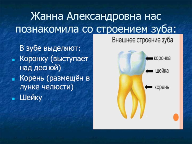 Слайд 8Жанна Александровна нас познакомила со строением зуба:
