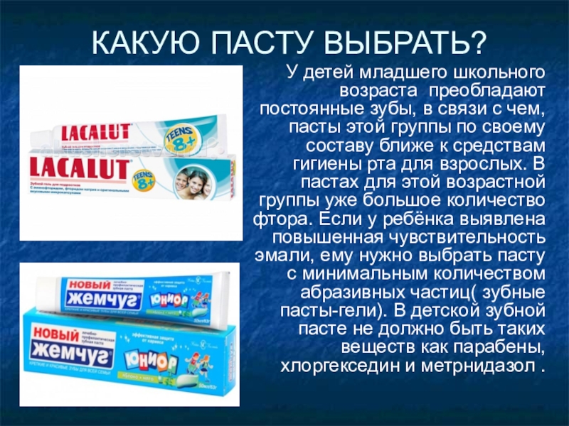 зубы, в связи с чем, пасты этой группы по своему составу ближе к средствам гигиены рта для взрослых. В пастах для этой возрастной группы уже большое количество фтора. Если у ребёнка выявлена повышенная чувствительность эмали, ему нужно выбрать пасту с минимальным количеством абразивных частиц( зубные пасты-гели). В детской зубной пасте не должно быть таких веществ как парабены, хлоргекседин и метрнидазол .