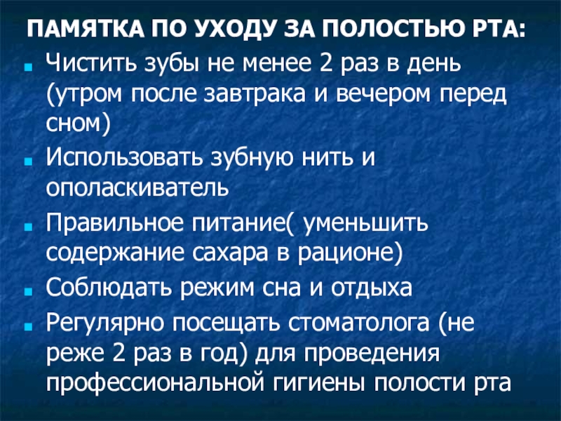 Слайд 30ПАМЯТКА ПО УХОДУ ЗА ПОЛОСТЬЮ РТА: