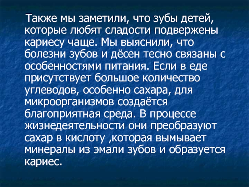 подвержены кариесу чаще. Мы выяснили, что болезни зубов и дёсен тесно связаны с особенностями питания. Если в еде присутствует большое количество углеводов, особенно сахара, для микроорганизмов создаётся благоприятная среда. В процессе жизнедеятельности они преобразуют сахар в кислоту ,которая вымывает минералы из эмали зубов и образуется кариес.