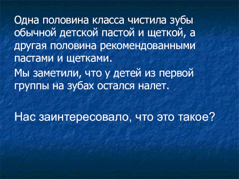 Слайд 17Одна половина класса чистила зубы обычной детской пастой и щеткой, а