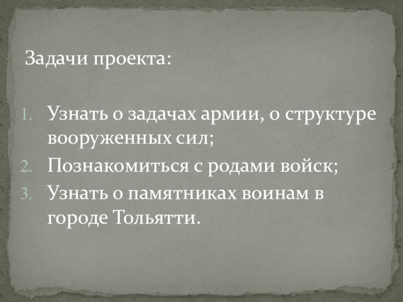 Задачи проекта:Узнать о задачах армии, о структуре вооруженных сил;Познакомиться с родами войск;Узнать о памятниках воинам в городе Тольятти.
