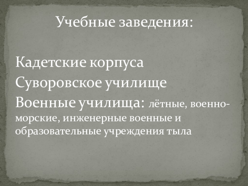 Учебные заведения:Кадетские корпусаСуворовское училищеВоенные училища: лётные, военно-морские, инженерные военные и образовательные учреждения тыла