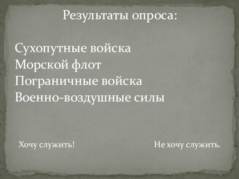 Результаты опроса:Сухопутные войскаМорской флотПограничные войскаВоенно-воздушные силыХочу служить!