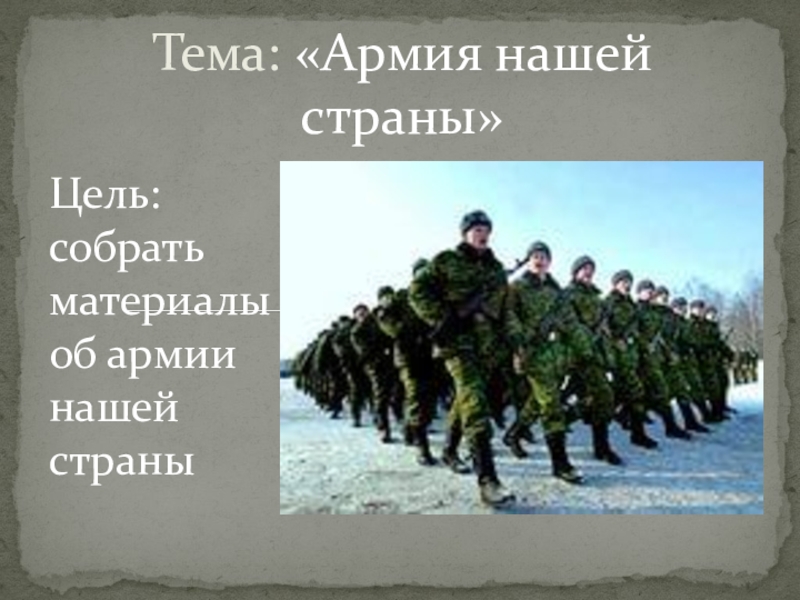 Тема: «Армия нашей страны»Цель: собрать материалы об армии нашей страны