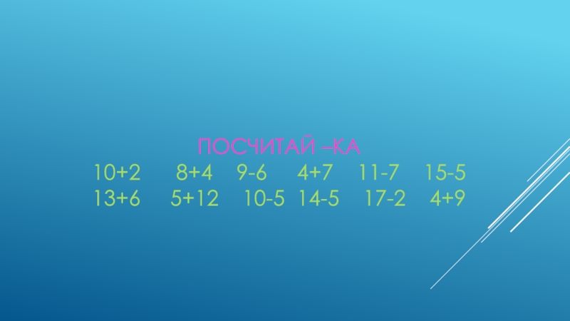 Слайд 8Посчитай –ка 10+2 8+4 9-6 4+7