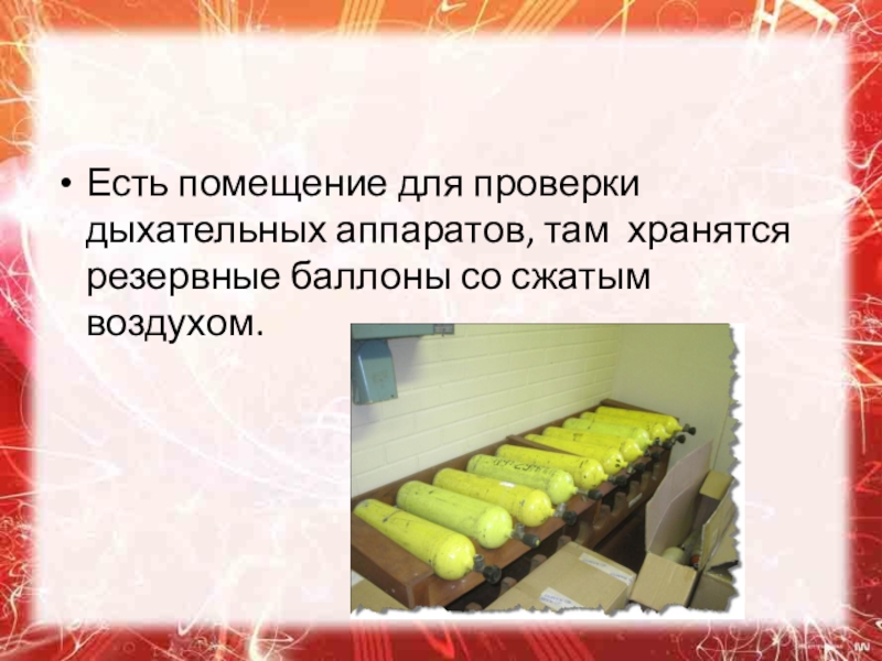 Слайд 58Есть помещение для проверки дыхательных аппаратов, там хранятся резервные баллоны со