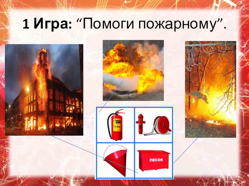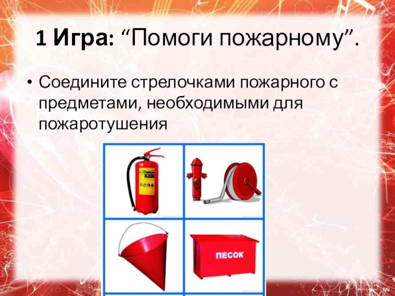 Соедините стрелочками пожарного с предметами, необходимыми для пожаротушения