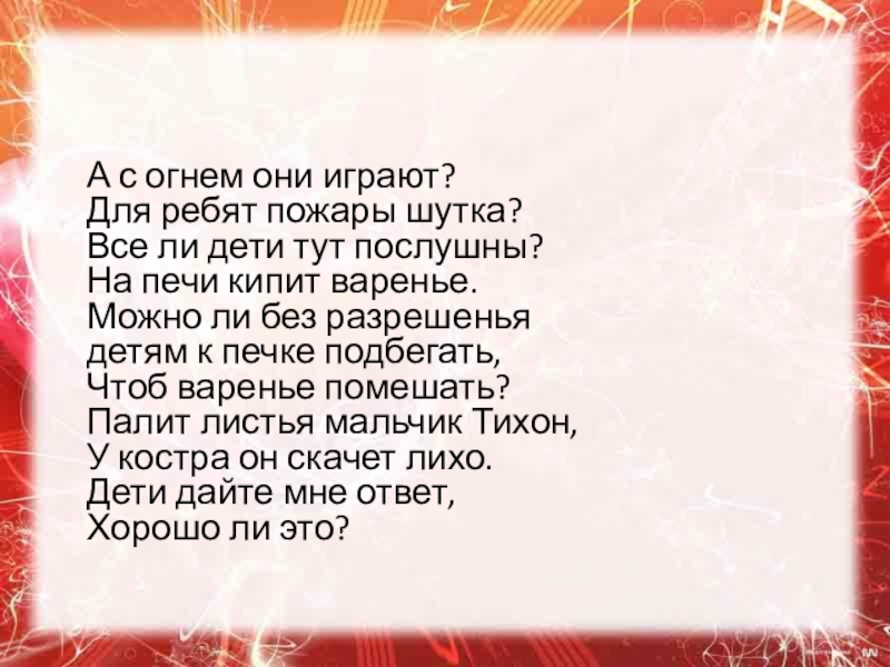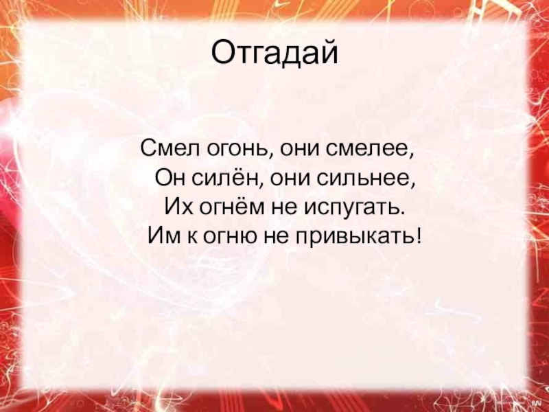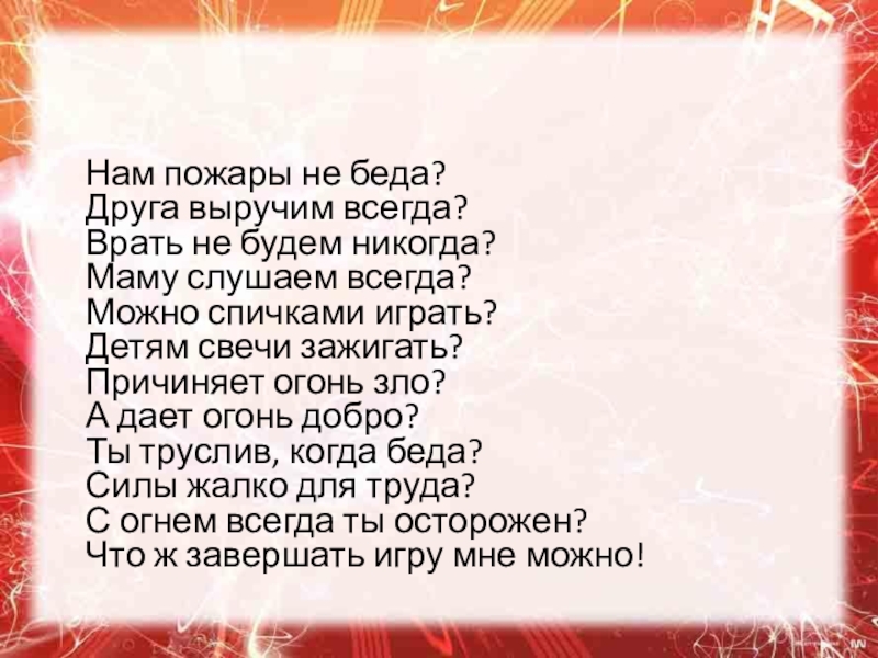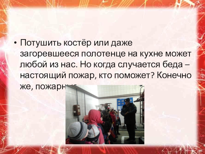 нас. Но когда случается беда – настоящий пожар, кто поможет? Конечно же, пожарные.