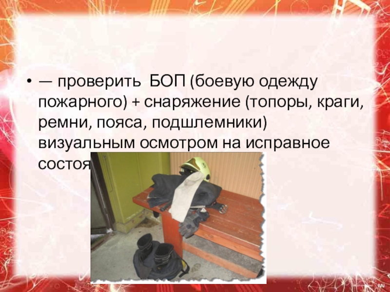 Слайд 10— проверить БОП (боевую одежду пожарного) + снаряжение (топоры, краги, ремни,