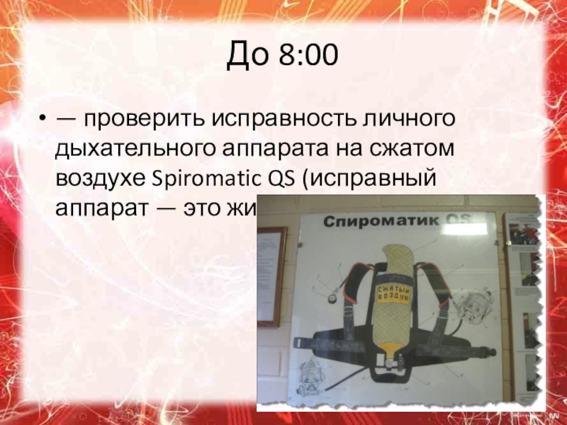 — проверить исправность личного дыхательного аппарата на сжатом воздухе Spiromatic