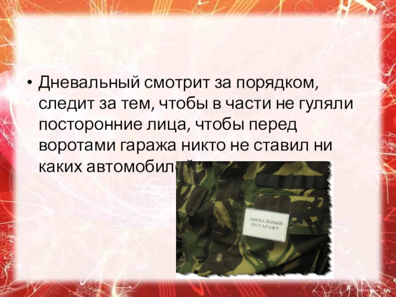 Слайд 60Дневальный смотрит за порядком, следит за тем, чтобы в части не