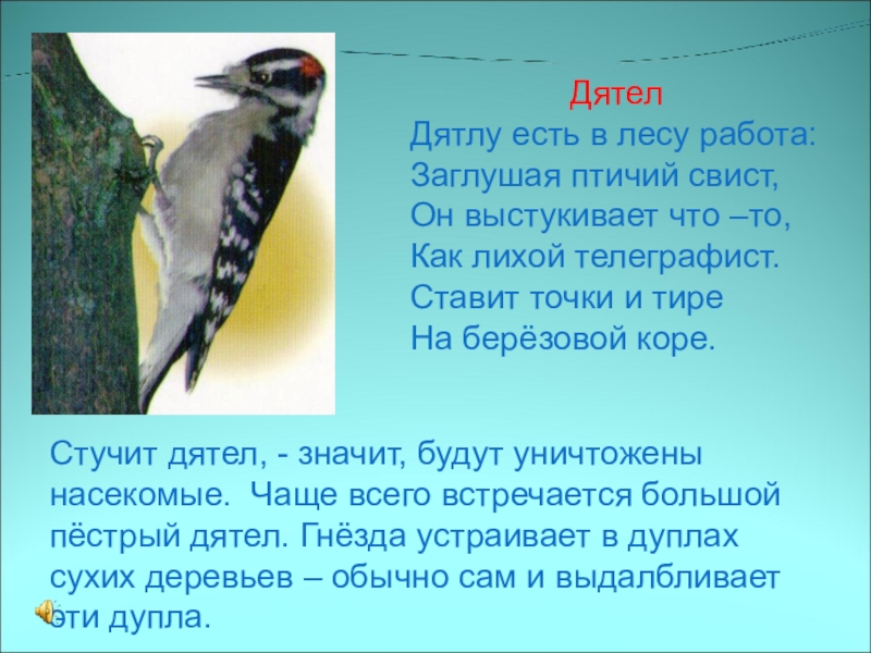 Стучит дятел, - значит, будут уничтожены насекомые. Чаще всего встречается большой пёстрый дятел. Гнёзда устраивает в дуплах сухих деревьев – обычно сам и выдалбливает эти дупла.