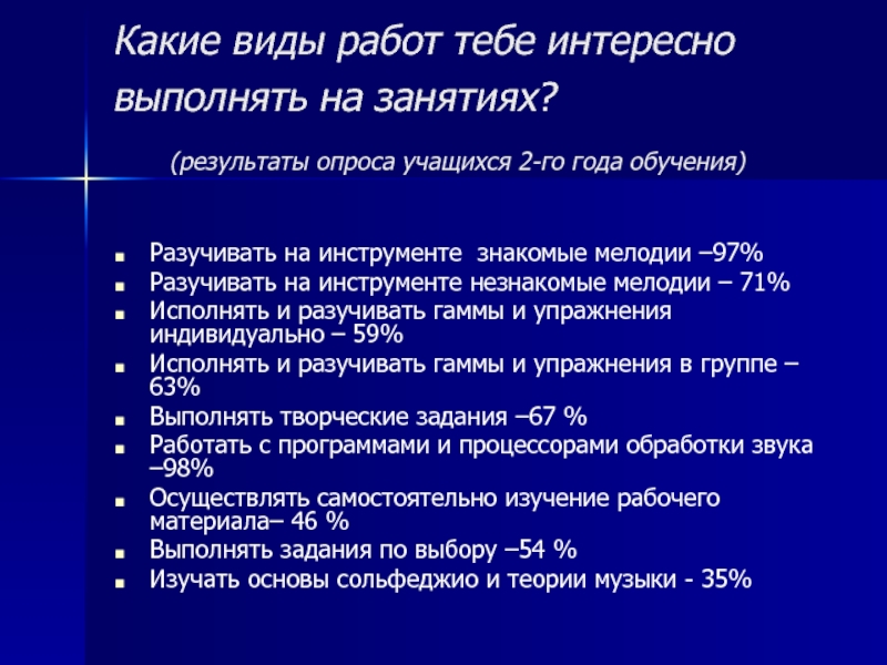 Исполнять и разучивать гаммы и упражнения индивидуально – 59%