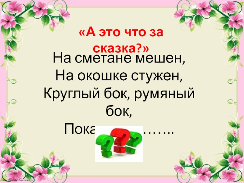 «А это что за сказка?»На сметане мешен,На окошке стужен,Круглый бок, румяный бок,Покатился……..