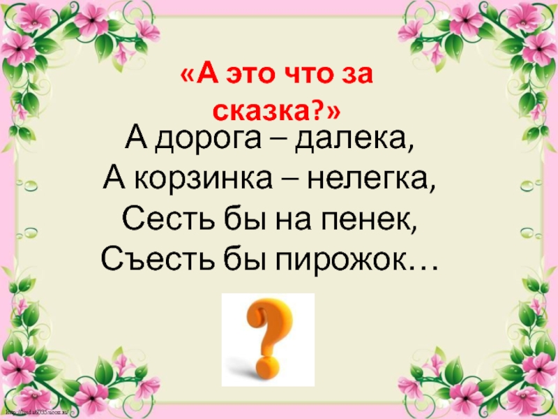 «А это что за сказка?»А дорога – далека,А корзинка – нелегка,Сесть бы на пенек,Съесть бы пирожок…