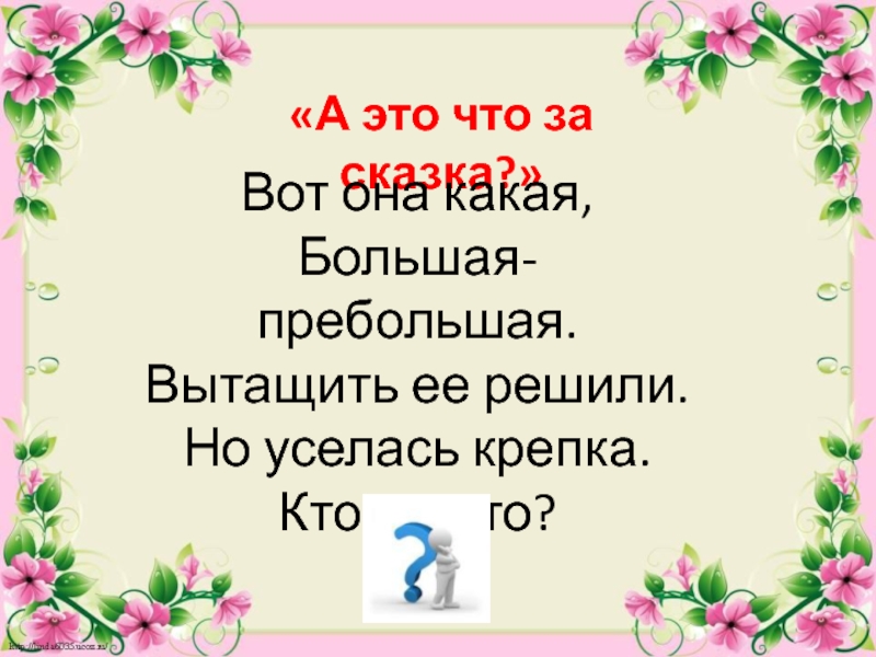 «А это что за сказка?»Вот она какая,Большая-пребольшая.Вытащить ее решили.Но уселась крепка.Кто же это?