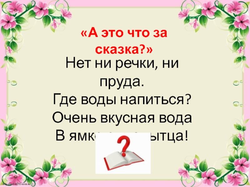 «А это что за сказка?»Нет ни речки, ни пруда.Где воды напиться?Очень вкусная водаВ ямке от копытца!