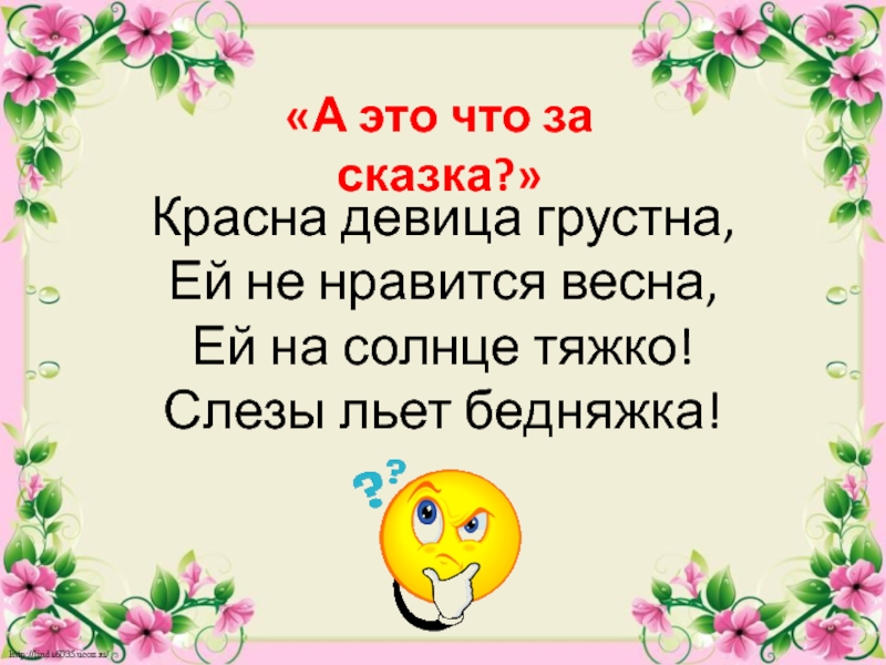 «А это что за сказка?»Красна девица грустна,Ей не нравится весна,Ей на солнце тяжко!Слезы льет бедняжка!