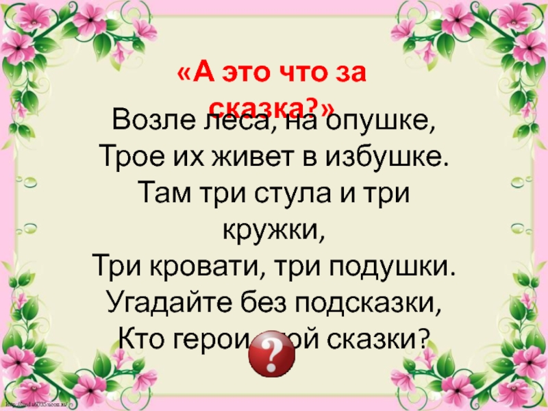 «А это что за сказка?»Возле леса, на опушке,Трое их живет в избушке.Там три стула и три кружки,Три
