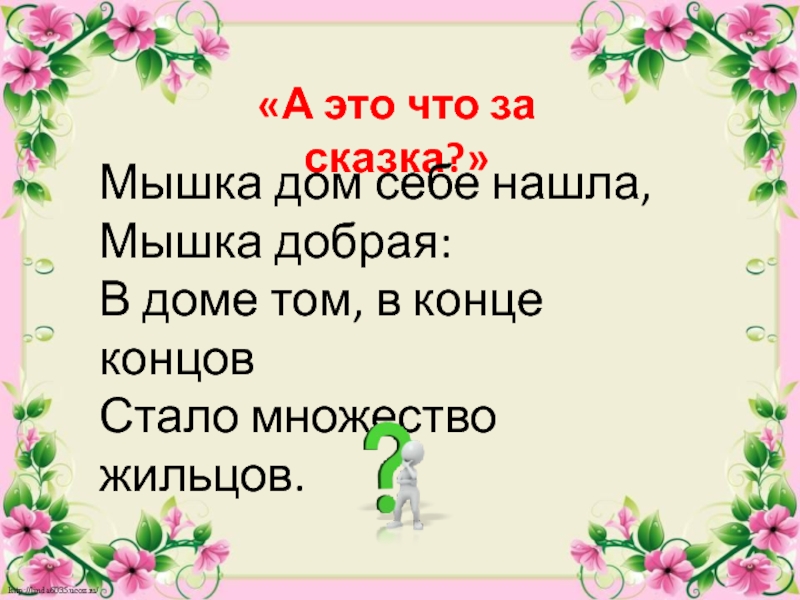 «А это что за сказка?»Мышка дом себе нашла,Мышка добрая:В доме том, в конце концовСтало множество жильцов.